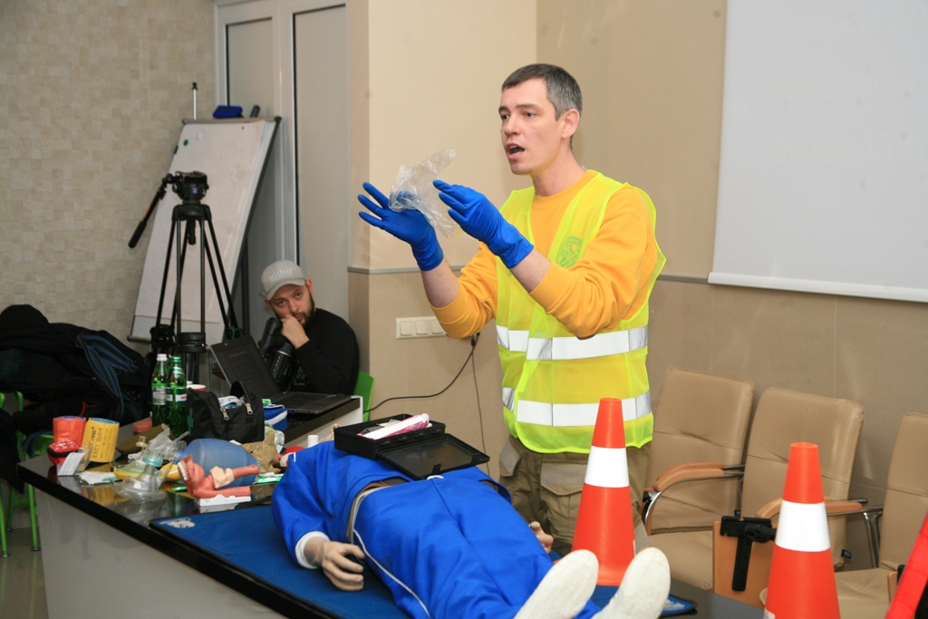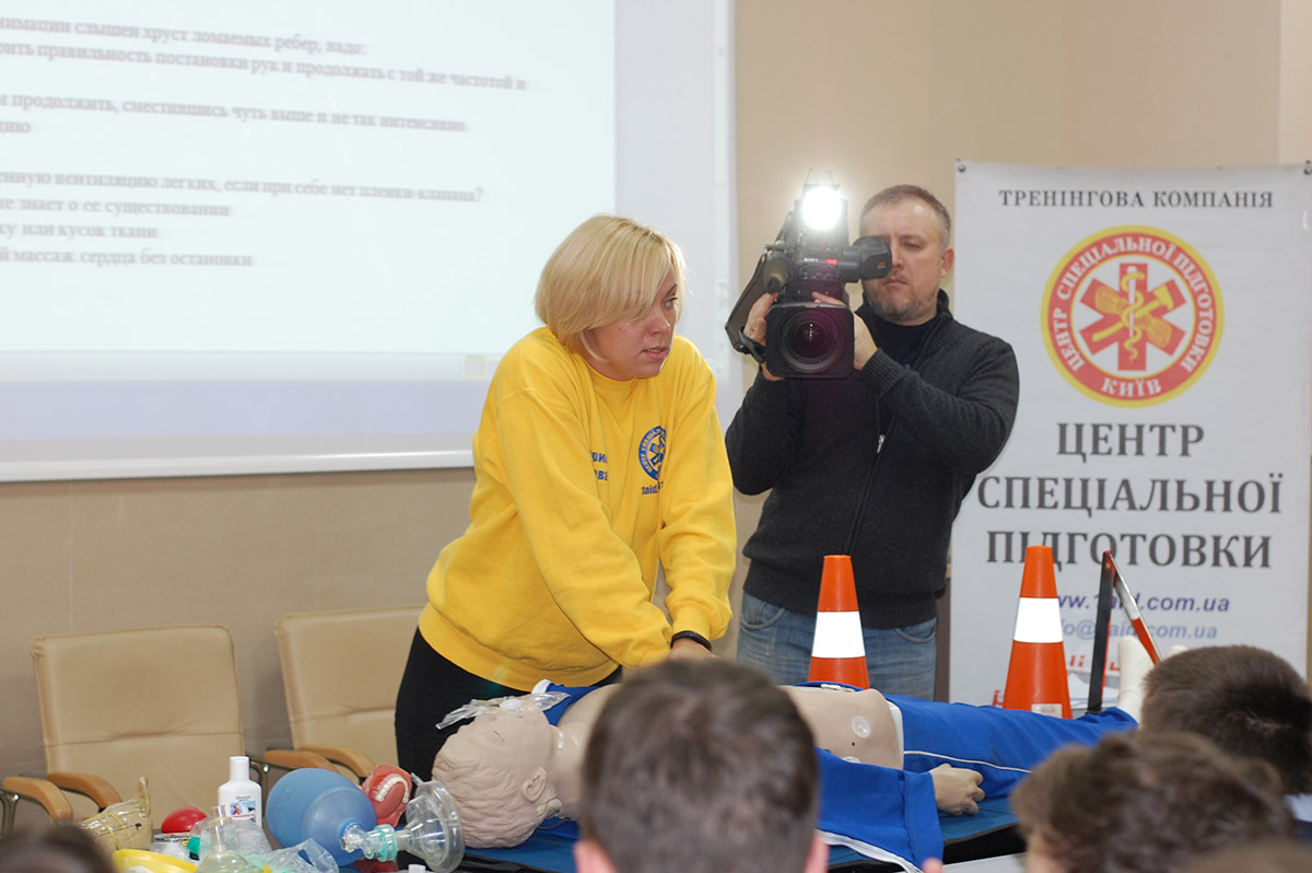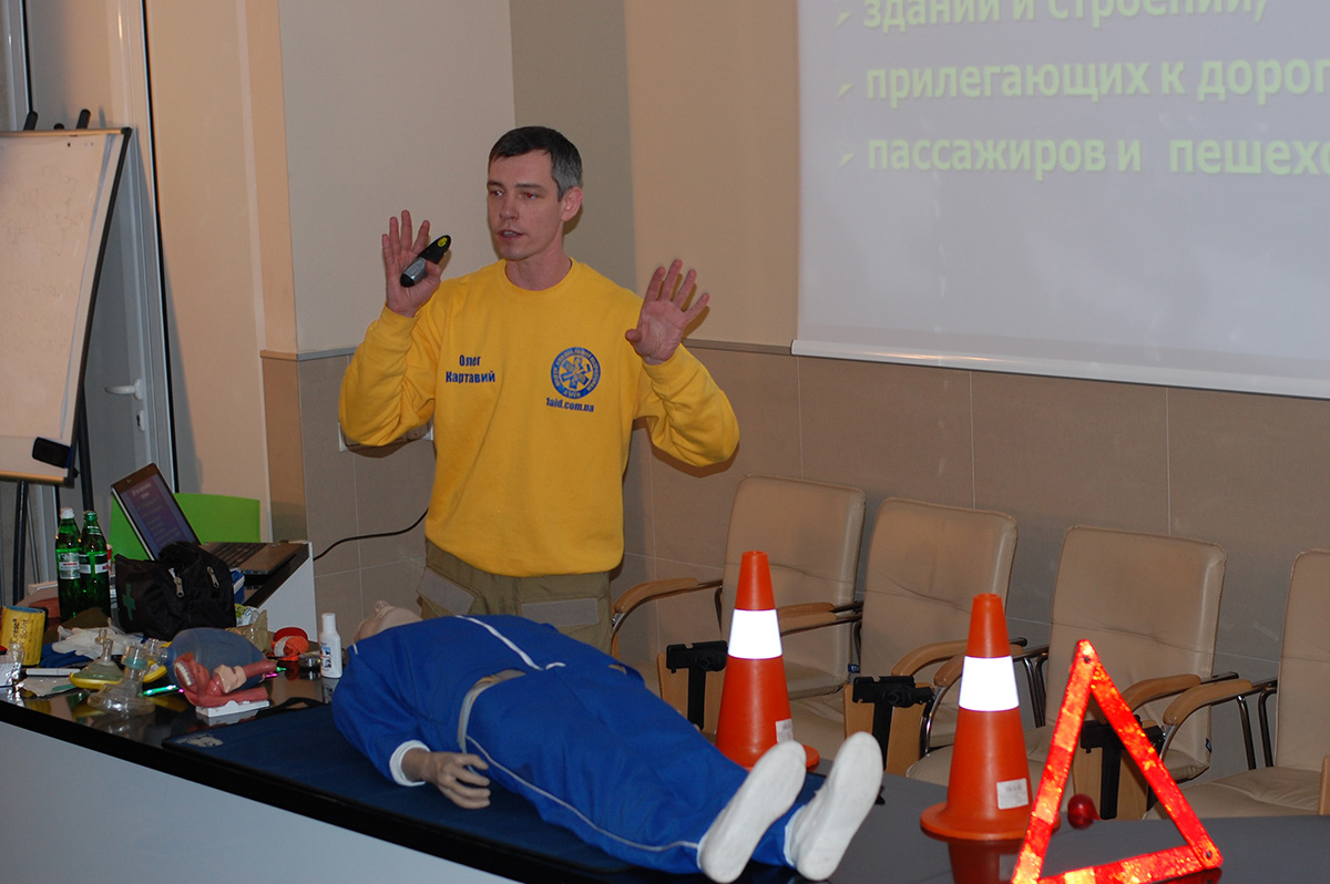 І тільки після цього треба розпочинати діяти.», – так розпочав майстер-клас «Надання невідкладної допомоги при ДТП» Олег Картавий – керівник «Центру спеціальної підготовки», тренери якого проводитимуть ці майстер-класи у школах в рамках проекту Traffic Challenge під час Тижня з безпеки життєдіяльності.